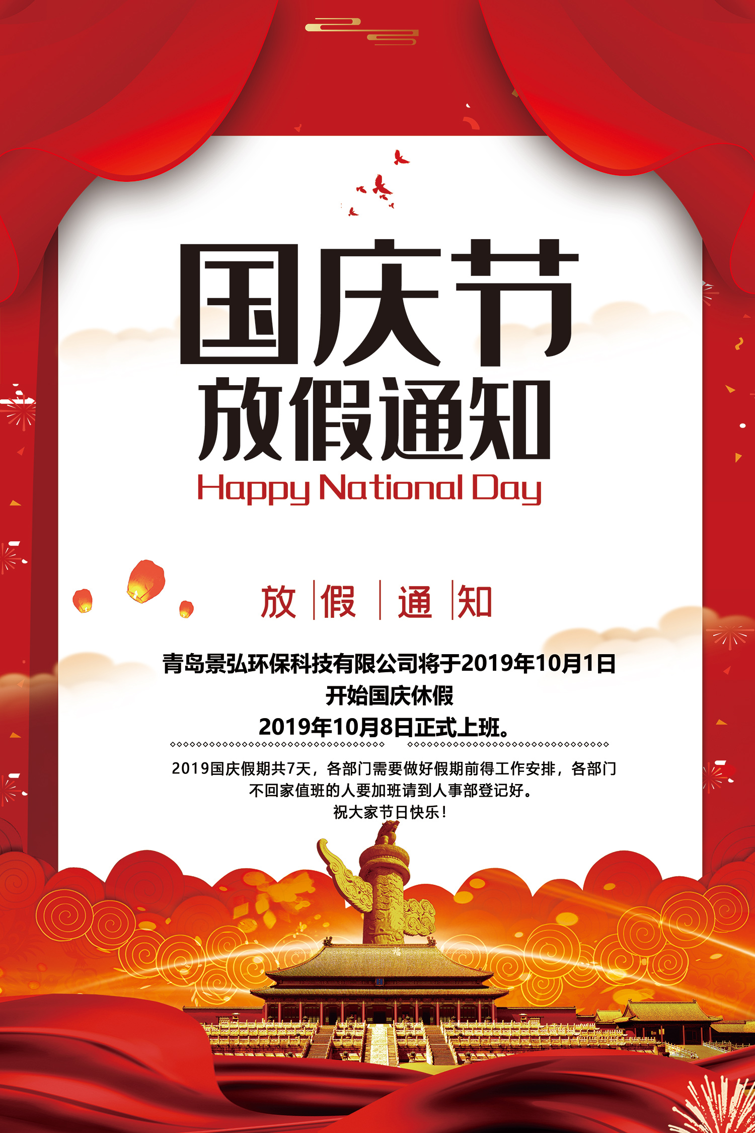 2019年度國(guó)慶節(jié)放假通知