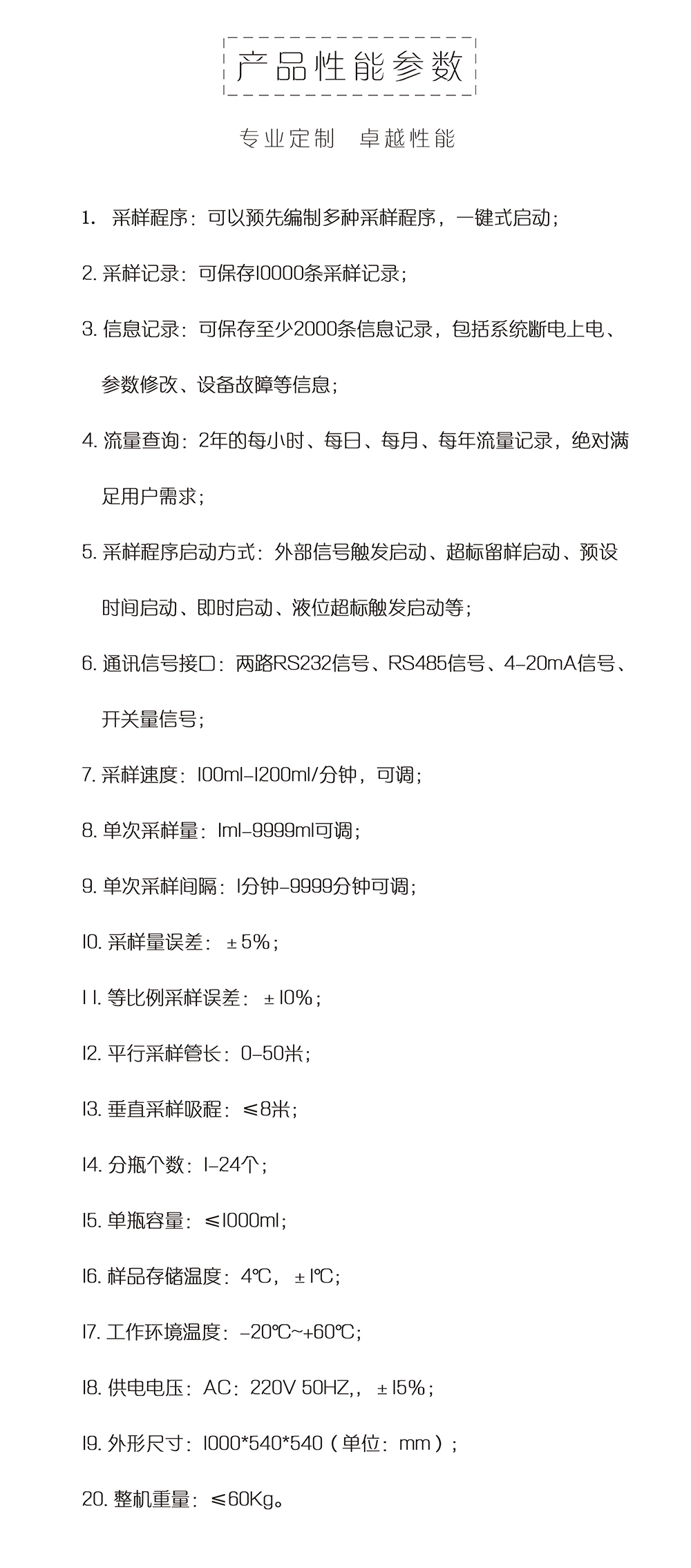 儀器采用可靠蠕動(dòng)泵,混合式步進(jìn)機(jī)驅(qū)動(dòng),滿足各類環(huán)境條件下的水質(zhì)采樣。適用于各*環(huán)境監(jiān)測(cè)站、污水處理廠、水利、水務(wù)及科研院所,對(duì)工業(yè)污水排放口、江、河、湖、海等水樣的采集。