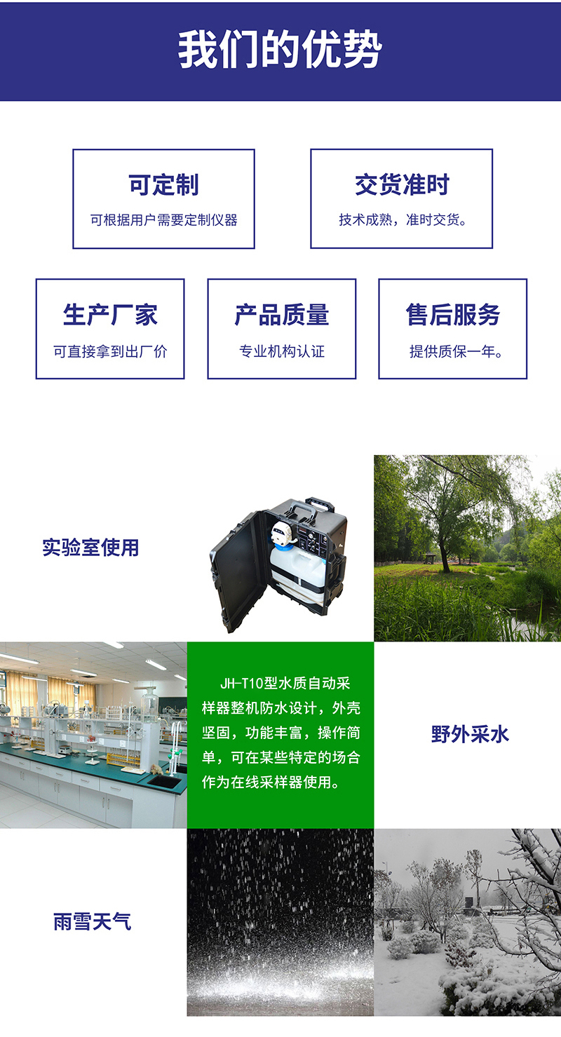 JH-T10水質(zhì)自動(dòng)采樣器整機(jī)防水設(shè)計(jì),外殼堅(jiān)固,功能豐富,操作簡(jiǎn)單,可全天候應(yīng)用,無(wú)需有復(fù)雜的專(zhuān)業(yè)知識(shí),該產(chǎn)品非常方便用戶(hù)便攜應(yīng)用,亦可在某些特定的場(chǎng)合作為在線采樣器使用,性?xún)r(jià)比高,滿足用戶(hù)的應(yīng)用需求。