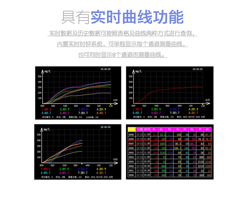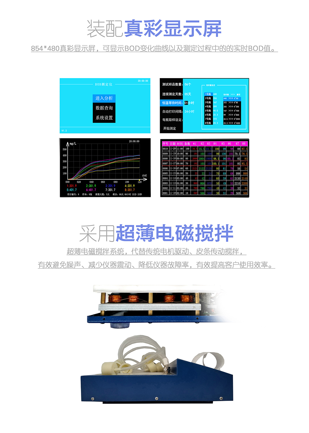 2、 真彩顯示屏,可顯示BOD變化曲線以及測定過程中的的實(shí)時(shí)BOD值。