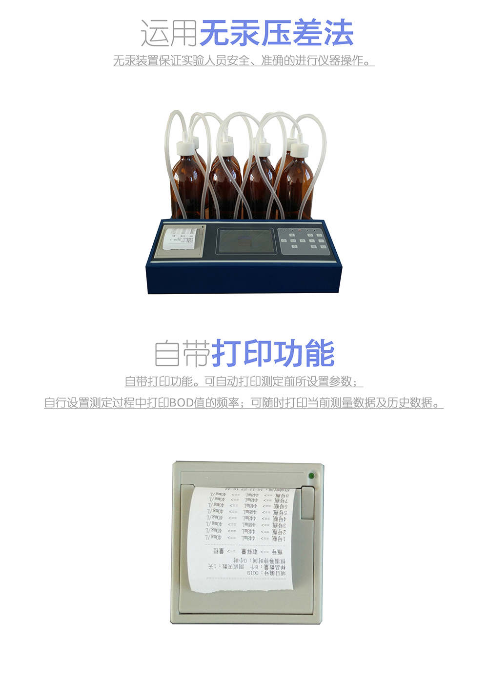 3、 自帶打印功能。可自動打印測定前所設(shè)置參數(shù);自行設(shè)置測定過程中打印BOD值的頻率;可隨時(shí)打印當(dāng)前測量數(shù)據(jù)及歷史數(shù)據(jù)。