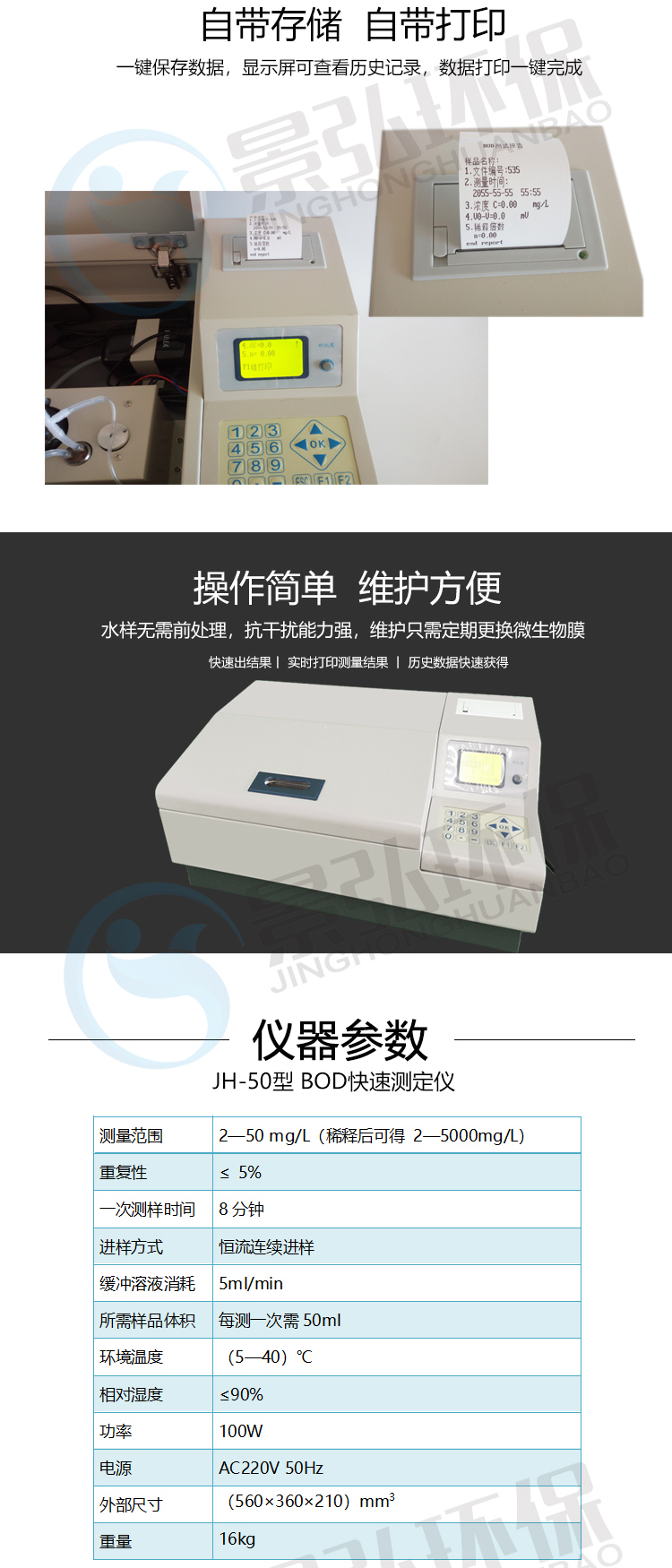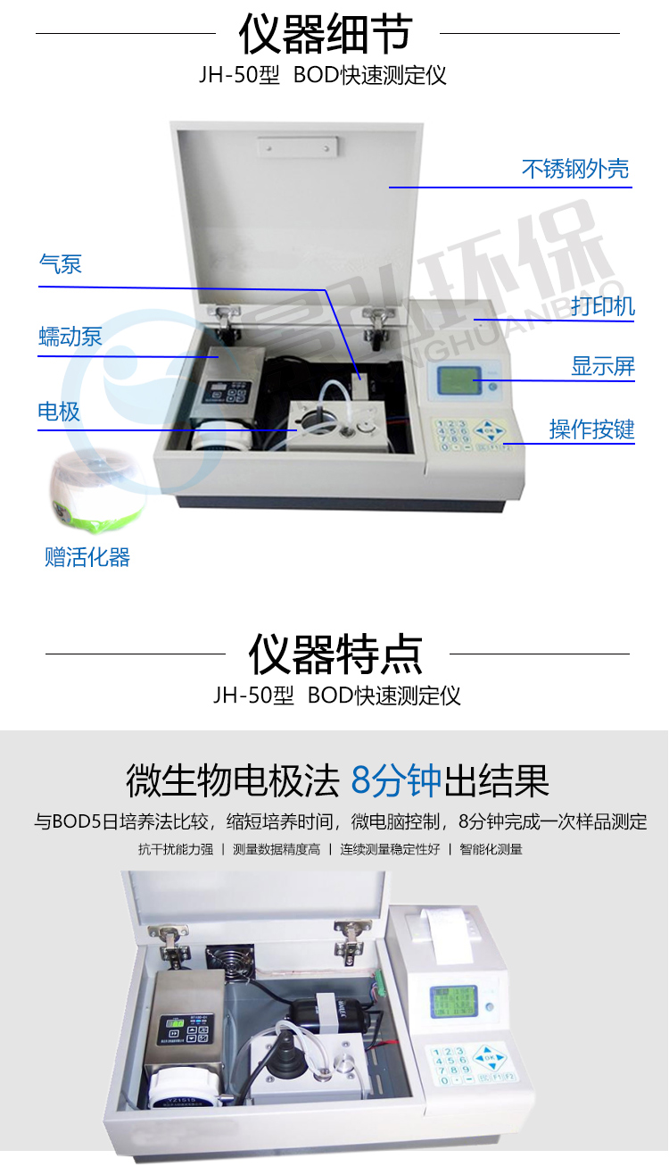 JH-50型BOD快速測定儀采用微生物電*法,能快速測定水樣中的BOD值,而且操作簡便,測量準(zhǔn)確。其原理基于微生物對有機(jī)物的耗氧代謝,測定BOD只涉及到初始氧化速率,因而可在8-15分鐘內(nèi)完成一個樣品的測定。大大縮短了測定所需的時間。該方法符合《水質(zhì)生化需氧量(BOD)微生物傳感器快速測定法》(HJ/T86-2002),在2002年出版發(fā)行的《水和廢水檢測分析方法》(第四版)列為A類方法。