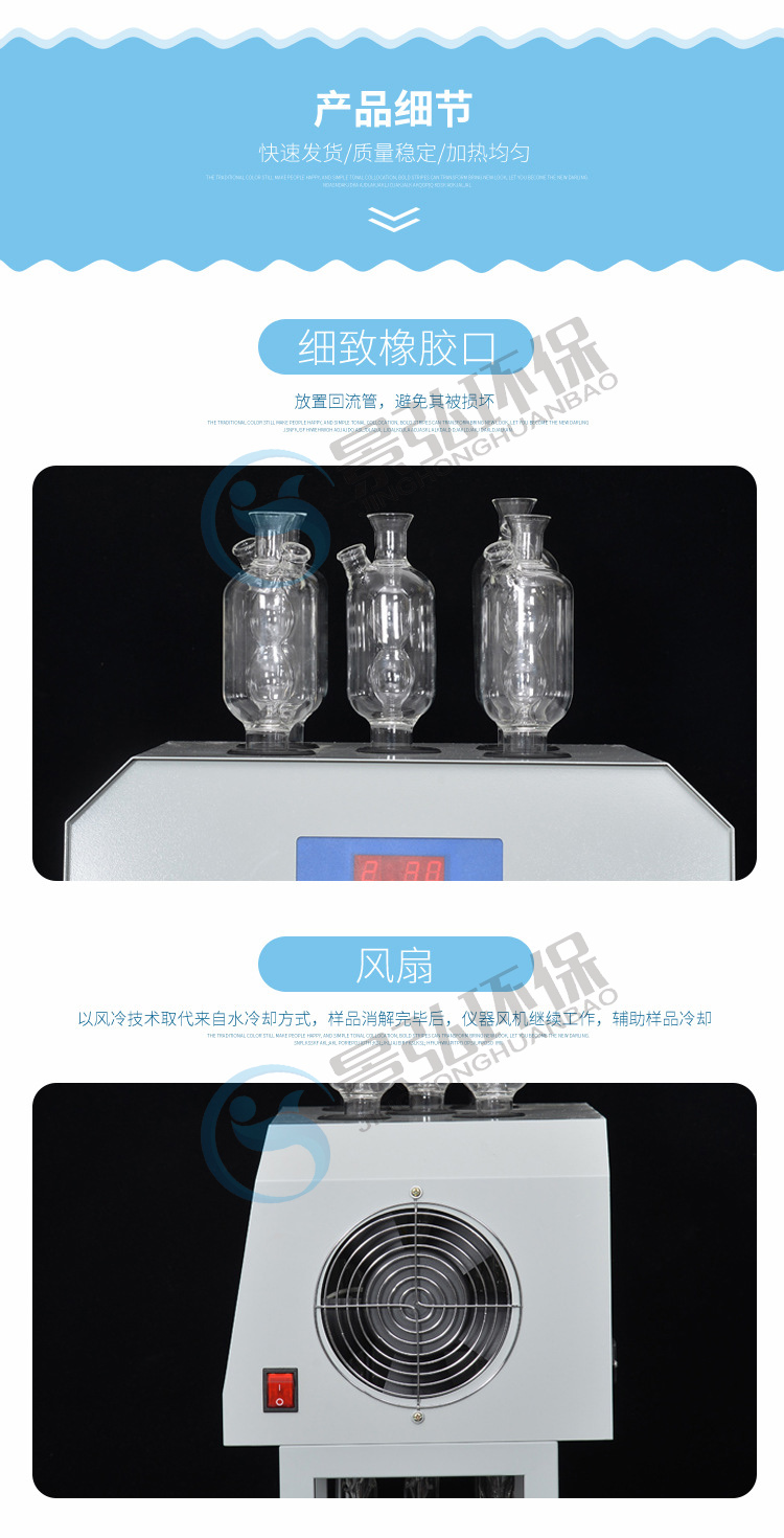儀器采用微機(jī)技術(shù)進(jìn)行定時(shí)控制加熱電爐,可對(duì)6個(gè)消解器瓶回流裝置同時(shí)進(jìn)行加熱。從而達(dá)到節(jié)能增效的目的。 該儀器采用玻璃玻璃毛刺回流管代替球形回流管,并以風(fēng)冷技術(shù)取代水冷,從而提高儀器的穩(wěn)定性和安全性。