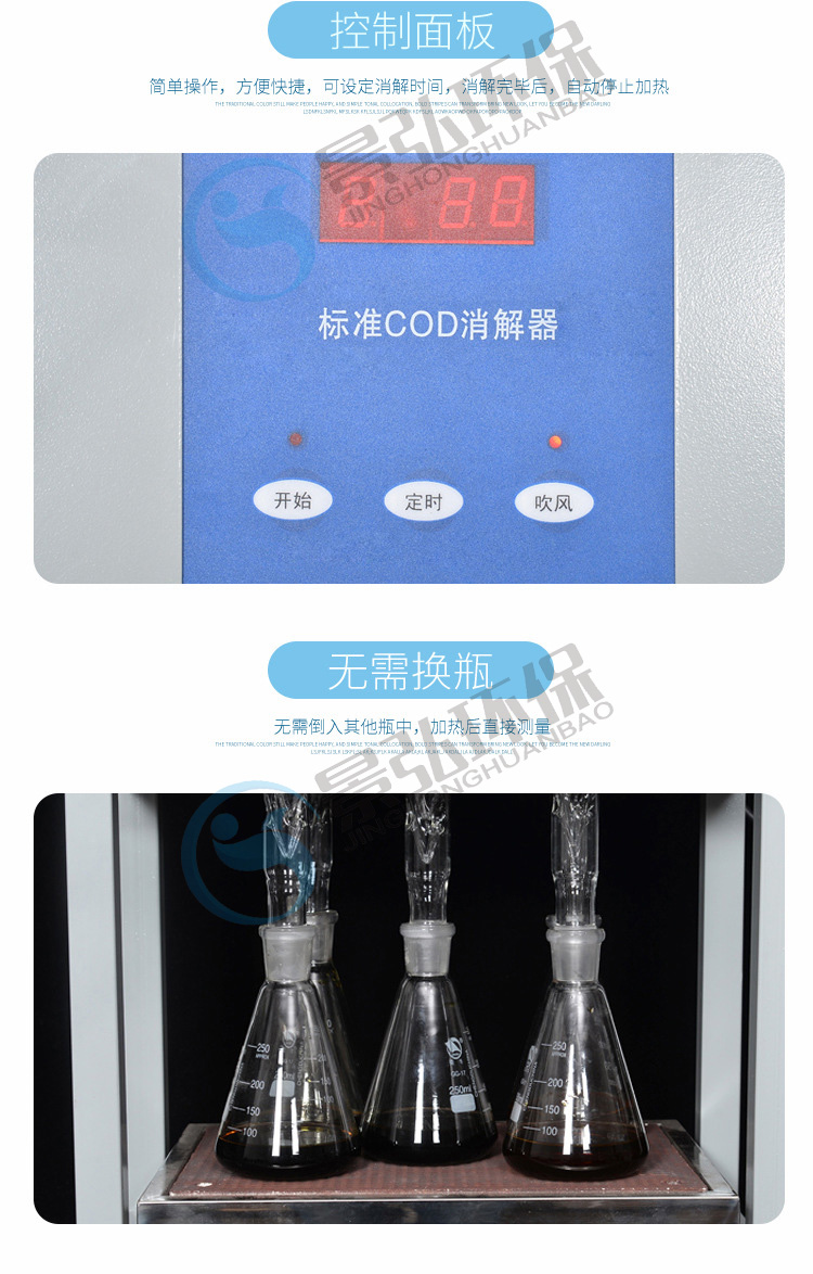 儀器的化學(xué)溶液配制、操作和COD的計(jì)算遵照GB11914-89,低于50mg/L的COD水樣可通過(guò)稀釋滴定劑和氧化劑來(lái)提高精確度,高于1000mg/L的COD水樣,可通過(guò)水樣的比例稀釋來(lái)完成測(cè)定。