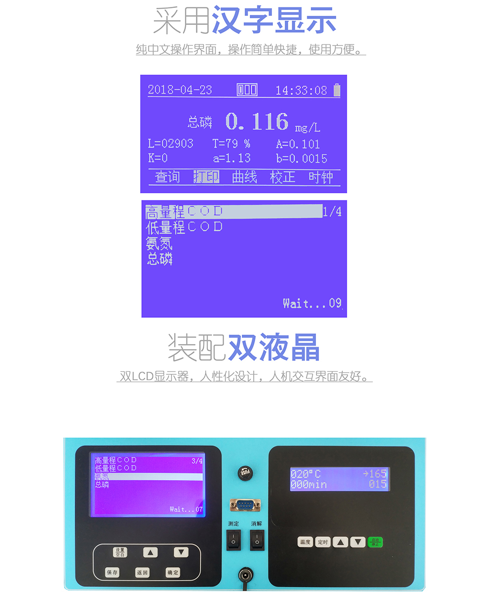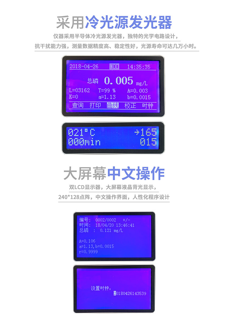 JH-TP202型總磷快速測定儀符合GB11893-89 規(guī)定的鉬酸銨分光光度法,將經(jīng)典的酸銨分光光度法與計算機(jī)技術(shù)結(jié)合起來,應(yīng)用微電腦光電子比色檢測原理取代傳統(tǒng)的目視比色法,測量分辨率大大提高。該產(chǎn)品具有自動PID控溫、雙液晶顯示、交直流兩用、自動調(diào)零、濃度直讀、曲線存儲、自動打印等特點(diǎn),儀器操作簡便,人機(jī)交互式操作,使用者無需復(fù)雜的專業(yè)知識即可應(yīng)用本產(chǎn)品??蓮V泛地應(yīng)用于廠礦企業(yè)排污口監(jiān)測、城市污水處理工廠進(jìn)出口監(jiān)測、江河湖泊水質(zhì)監(jiān)測和污水治理設(shè)施過程控制之中。